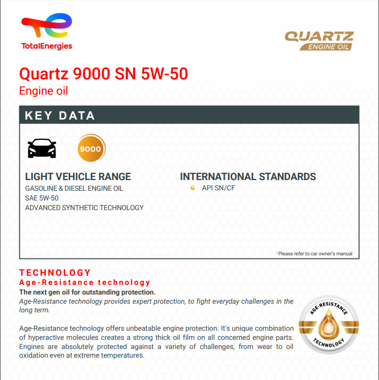 Quartz 9000 SN 5W-50 is recommended for all petrol engines (multi-valve and turbo types, with or without catalytic converter) and all diesel engines, turbo-charged or naturally aspirated in cars and light vans.